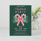 This Christmas party invitation design features watercolor peppermint candy canes, a large red bow with Christmas greenery such as holly with red berries, pine needles and red florals on a dark green background. You can customise all the text for your event. On the back of the invitation is a candy cane pattern with many of the same illustrations and more peppermint candy on a deep red background. See the whole matching collection.
