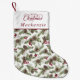 This personalised Christmas stocking features a pattern of pinecones, pine boughs and other greenery sprigs, and burgundy red holly berries on a white background. At the top is elegant script calligraphy Merry Christmas with customisable name template. Check out the collection for many matching products, or contact me through Zazzle Chat if you would like additional matching products or other colorways.