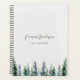 Custom-designed spiral planner featuring watercolor pine trees design with custom name and text on light grey colour background.