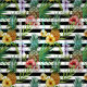 Watercolor pineapple and tropical flowers on black stripes background