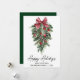 Modern Elegant Calligraphy Ink Script Watercolor Pines Winter Greenery with Burgundy Red Ribbon Bow Christmas Ornaments, Pine Cones and Holly Berries Happy Holidays Card - Green