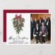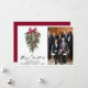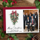 Modern Elegant Calligraphy Ink Script Watercolor Pines Winter Greenery with Burgundy Red Ribbon Bow Christmas Ornaments, Pine Cones and Holly Berries Company Photo Merry Christmas Card - Red