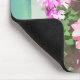 Watercolor style art depicting pink flowers with green foliage and beige and teal background.