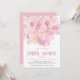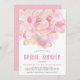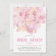 A pretty and modern bridal shower invitation in pink and white, featuring a large oversized watercolor peony flower head and brush lettered style font. The reverse is in solid pink with a white trellis pattern overlay.
