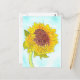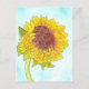 Watercolor rendition of a pretty yellow sunflower. Outlines in black ink and painted in watercolor. The petals are a combination of yellow and orange mingling together. The leaves are an olive green and the centre of the flower is a heavy textured application of burnt sienna, raw umber and other earthy colours. The background is a light sky blue and has a cheerful summery feel to it. Original artwork.