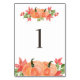 Table 1. Festive table numbers card featuring watercolor illustrations of pumpkins and maple leaves. This pumpkin table number is perfect for Thanksgiving and fall weddings, graduation, baby showers, bridal showers and other events.
