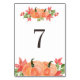 Table 7. Festive table numbers card featuring watercolor illustrations of pumpkins and maple leaves. This pumpkin table number is perfect for Thanksgiving and fall weddings, graduation, baby showers, bridal showers and other events.