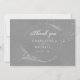 Thank you card, featuring watercolor Lavender flowers arranged in a wreath on a grey background. Complimentary watercolor spatter and wash, extra space on the back for a personal message.