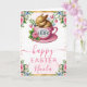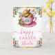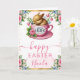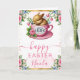 Share warm spring wishes with this adorable Easter card featuring a sweet sleeping bunny nestled inside a pink teacup adorned with delicate florals. Surrounding roses, tulips, butterflies, and soft watercolor greenery create a bright, uplifting frame that captures the joy of the season. The pastel palette and elegant Easter motifs make this design perfect for sending heartfelt greetings to friends and family. Customisable text allows you to add a name or message for a one‑of‑a‑kind Easter keepsake.