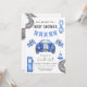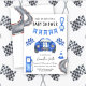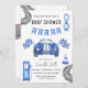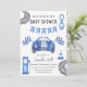Race car theme baby shower invitation card featuring watercolor illustrations of a blue car and racing track, gas station, race flag.