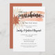 A Boho style baby shower invitation featuring a watercolor rainbow with gold glitter rays, and a little ray of sunshine on the way theme. A bold bohemian style with earthy colours.