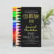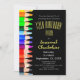 This fun kids birthday party invitation design features a column of rainbow watercolor pencils. All the party details are on the front with yellow font colour for the party and name information. Fill in the template text fields under personalise, remove any information or click customise to select a font style, size, and colour you prefer.