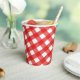 This bright and fun paper cup features a watercolor red and white plaid pattern.