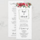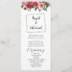 The design features an elegant watercolor floral wreath decorated with peonies, roses, eucalyptus greenery, and more in shades of red, green, and pink. The design also features a modern font and text layout. A matching floral arrangement is added to the back to carry over the overall theme. The natural palette makes it great for summer weddings, boho weddings, fall weddings, and rustic weddings.
