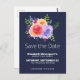 Save the date postcard for a mother's day brunch or other event. Designed with a nice bouquet of watercolor roses with sprigs, leaves and branches all together in a colourful floral arrangement. Navy blue background.