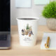 These cosy, rustic holiday party paper cups feature a watercolor illustration of a cute female gnome seated next to a miniature Christmas tree, a basket of birch logs, and some candles. The words "MERRY CHRISTMAS" appear in grey serif letters that coordinate with the art. Add your family's name in charcoal grey italics.