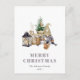 This cosy, rustic holiday postcard features a watercolor illustration of a cute female gnome seated next to a miniature Christmas tree, a basket of birch logs, and some candles. The words "MERRY CHRISTMAS" appear in grey serif letters that coordinate with the art. Add your family's name and the year in charcoal grey italics, and your return address on the reverse.