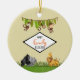 A personalised decorative baby ornament. A cool jungle safari theme. Designed with a banner of jungle leaves at the top and mischievous monkeys hanging upside down. A hippo, gorilla, lion and giraffe hanging out on the bottom in some savannah grasses. Set on a tan background. In the centre is a diamond shaped frame which you can personalise with a name and birth date.