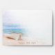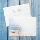 "Seas the Day" quote in beach sand. Captivating watercolor of beached fishing boat on beach with tropical aqua blue ocean, and sunny sky above. Template on back flap for return address.