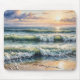 Waves gently crash onto the shore, illuminated by the soft glow of the setting sun. The sky reflects hues of orange and pink, surrounded by scattered clouds.
