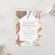 Cute summer beach theme bridal shower invitations feature a border of watercolor sea shells, starfish, and sea glass, including junonia, conch, sand dollar, auger, and clam. Personalise with your bridal shower details in the centre.