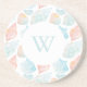 Watercolor seashell pattern monogram coaster in shades of ocean and sunset.