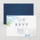Trendy navy and white ocean theme beach wedding RSVP cards featuring sea ferns, seaweed and starfish designed to be quickly and easily customised to your event specifics.