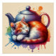 Sweet sleeping kitty keeping warm by a pot of tea.