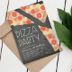 Invite friends to your child's pizza party birthday with these cute invitations. Design features your party details surrounded by colourful watercolor pepperoni pizza slices on a rustic chalkboard background. Add your party details using the template fields provided.