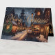 Holiday Christmas town photo card. Watercolor design with a vintage feel. Evening winter scene of an old Victorian town decorated for the holidays. Get into the holiday spirit with our cosy golden watercolor Christmas town photo card! Share the joy this season with a touch of magical charm.