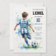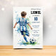 Kick off the celebration for your little soccer star! This personalized birthday party invitation features a beautiful watercolor illustration of a young player, perfect for an action-packed party. The artistic and modern design, with its cool blue and green splashes of color, will get everyone excited for game day. Easily customize all the details to invite friends and family to your son's big match. It's the perfect way to set the theme for a fun and memorable birthday!