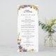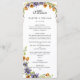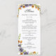 Wedding menu featuring watercolor spring flowers, such as clematis, orange tulips, forsythia and bare twigs.