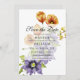 Elegant watercolor wedding save the date card featuring a spring floral arrangement such as tulips, forsythia and clematis. Your details are overlaid on a sheer transparent white square.
