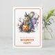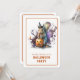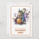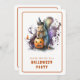 Cute Halloween kids party design with a cute illustration featuring a watercolor squirrel with a pumpkin.