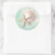 Watercolor inspired beach wedding favour sticker with bride and groom's names and wedding date. Aqua mint watercolor design with starfish and sand dollar.