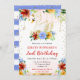 Elegant Watercolor Swan with red, blue and yellow Summer Flowers, gold borders and gold glitter confetti with blue stripes background