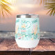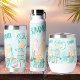 Festive summer theme wine tumbler featuring a watercolor tropical summer surf party-themed design. The design features a pastel watercolor aesthetic with a light blue background and beach-related illustrations. Phrases such as "Enjoy Your Summer" in stylish, handwritten-style lettering, two surfboards, one with the word "Aloha" written on it, colourful wooden signposts pointing in different directions, with words like "Beach," "Surf," "Bar," and "Sea" written on them. A tropical drink in a coconut shell with a straw and garnished with a flower and citrus slice. A pink-and-orange gradient acoustic guitar. Palm trees, tropical leaves, and flowers adding to the beachy vibe. A great gift for a summer bridal shower or bachelorette party or your next happy hour in your backyard.
