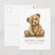 A gentle get well postcard featuring a soft watercolor teddy bear and a warm “sending you a big bear hug” message. The clean layout keeps the focus on the illustration and words, creating a comforting design that feels thoughtful without being overdone. A simple way to send encouragement and let someone know you’re thinking of them during recovery.