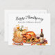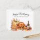 This custom holiday postcard features an elegant Thanksgiving dinner theme. A watercolor style image of various food and florals from a Thanksgiving dinner is placed in the bottom portion. A roasted turkey is placed between an apple pie and bottle of wine. A festive pumpkin and fall foliage is placed behind the feast. A "Happy Thanksgiving" greeting is placed at the top in an elegant script font, followed by a sample family name. You can personalise the stickers to include your own custom name or message.