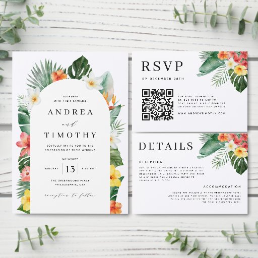 An elegant wedding RSVP card in tropical summer theme featuring hand painted watercolor banana leaves, hibiscus, palm leaves and plumeria. It includes a QR code for your visitors to scan to rsvp online.