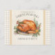 Gather your loved ones with this charming watercolor Friendsgiving postcard invitation. The design features a beautifully roasted turkey on a platter surrounded by herbs and berries, framed with a soft beige gingham border on each side. A muted cream-yellow watercolor wash sets the background, while the elegant script reads, “Please join us for a Friendsgiving Dinner Party.” The back includes customisable text fields for your event details, making it easy to personalise for your gathering. Perfect for hosting a warm and festive autumn celebration.