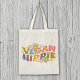 This "Vegan Hippie" tote bag features a quote with flowers.
