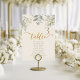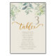 This elegant table number card features a beautiful watercolor design with lush eucalyptus greenery cascading from the top. The sophisticated script for 'table' and the prominent number '3' are rendered in a warm, inviting gold, creating a luxurious feel. Below, a space is provided to list the names of guests seated at this particular table, ensuring a seamless and personalised guest experience. The soft, neutral background complements the natural elements, making it a perfect addition to rustic, garden, or bohemian-themed weddings and events. Guide your guests effortlessly to their seats with this charming and functional piece of event stationery.