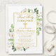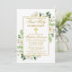 Modern Elegant Watercolor White Floral First Holy Communion Invitation includes white flowers, eucalyptus leaves and other beautiful botanical greenery foliage. Gold Cross.