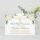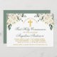 Elegant Watercolor White Floral First Holy Communion Invitation includes white roses & flowers and botanical greenery. Gold Cross. Sage Green Back.