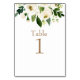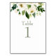 Gold Text Table Number. Watercolor White Floral & Foliage.