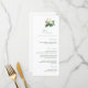 An elegant wedding menu featuring a watercolor white rose and botanical greenery. Designed with a beautiful calligraphy script to present your dinner courses for a spring or winter celebration in a cohesive green and white theme.