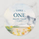 Elegant watercolor botanical table number card in a unique round format frames your details with a border watercolor mountains and florals in pale, cool shades of dusty blue, greys, yellows and greens. The font is set in modern sans serif and script typography. Perfect for spring, summer, fall autumn, rustic or garden theme weddings. To see more designs like this visit VG Invites at www.zazzle.com/vginvites