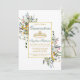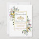 Modern Elegant Watercolor Wildflower Quinceanera Invitation includes delicate yellow, pink, purple, dusty blue and white wild flowers, eucalyptus leaves, sage green leaves and other botanical greenery on a gold frame. Gold Tiara Crown. Sage Green Back.