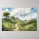 Watercolor painting of a path winding through a rocky meadow past an old farmhouse and towards distant hills to the horizon. Flocks of birds hover over the land under billowing clouds breaking up a deep blue sky.